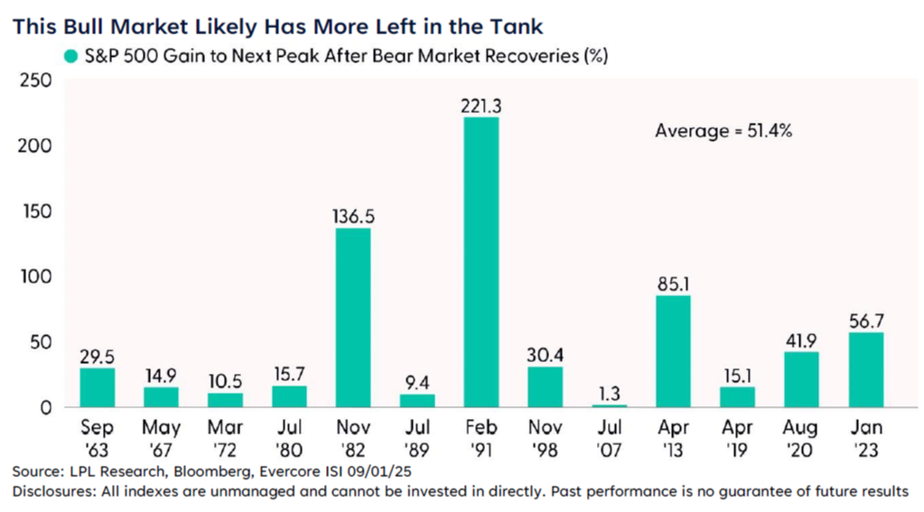 Another way to measure potential upside for this bull market from here is to consider the April–May 2025 sell-off a bear market, which it was on an intraday trading basis, with a more than 20% decline, and calculate remaining upside after those bear market losses were recovered. This is what we did in the “Bull Markets Often Run Another Year or Two After Bear Market Recoveries” and “This Bull Market Likely Has More Left in the Tank” charts, with help from our friends at Evercore ISI. Based on this historical perspective, since recovering from the April–May tariff scare decline (so-called “Liberation Day”) in late June, this bull market may have 27 more months and another 51% of upside before it’s over. That may be optimistic given the losses earlier this year were not as severe as most bear markets, so perhaps the median historical gain of 30% over 16 months post-recovery is a more reasonable bull case scenario.