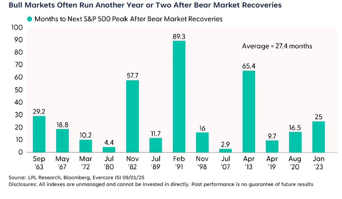 It may seem like the stock market has come too far too fast, but it is just following the playbook. Recoveries from sizable market declines tend to be followed by more gains over a period of years. Volatility will come at some point, as it always does, especially given rich valuations. The seasonally weak period of September would be a logical time for a pullback. Inflation remains sticky, with more tariffs on the way. Job growth has stalled. AI investment could prove less fruitful than expected. And the possibility of a disruptive geopolitical shock cannot be dismissed. Nonetheless, we expect this bull market to keep running, powered by moderate but steady economic growth poised to pick up next year, Fed rate cuts and stable long-term interest rates as inflation normalizes, and the powerful ongoing AI capital investment cycle.