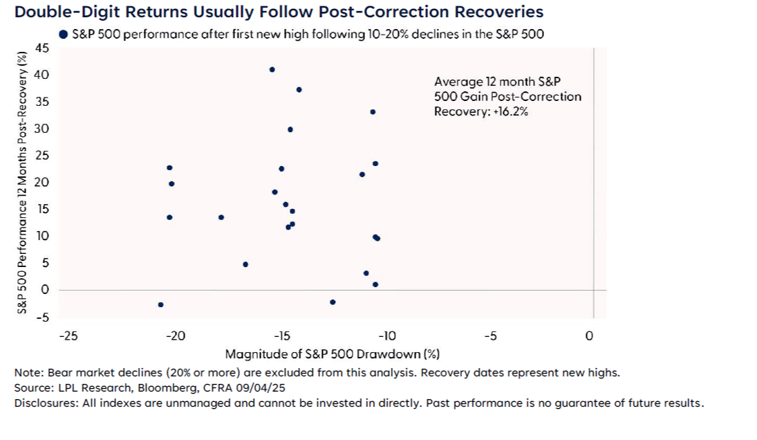 After recoveries from stock market corrections, with corrections defined as 10–20% declines in the S&P 500, double-digit gains over the subsequent 12 months have been commonplace. In fact, stocks rose double digits in 70% of the 23 corrections studied back to 1950, with average and median gains of 16.2% and 14.6% respectively. The S&P 500 was only down one year later in two cases: during the dotcom bust in 2000 and the pandemic in 2020. In other words, it takes a lot to derail a bull market that has broken out to new highs.